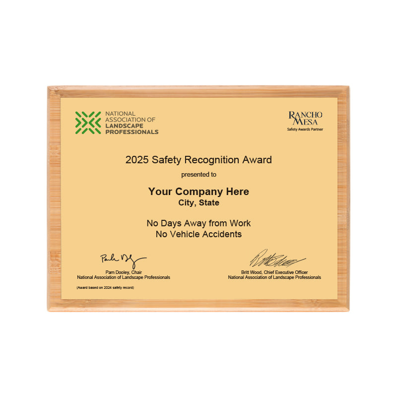 The No Days Away from Work_No Vehicle Accidents plaque is 9 x 12" with a satin gold aluminum plate, bamboo base, and full color logos. It makes a strong statement about your commitment to employee safety.